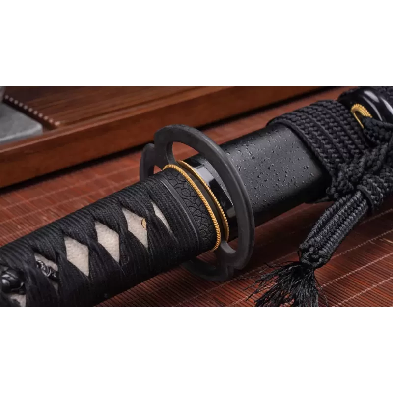 Elegante Details wie die Musashi-Tsuba, messingfarbene Habaki und Seppa sowie dekorative Menuki unterstreichen den traditionellen Charakter dieses hochwertigen Samurai-Schwertes. Das Katana wird mit einer schwarzen Saya und passendem Sageo geliefert.