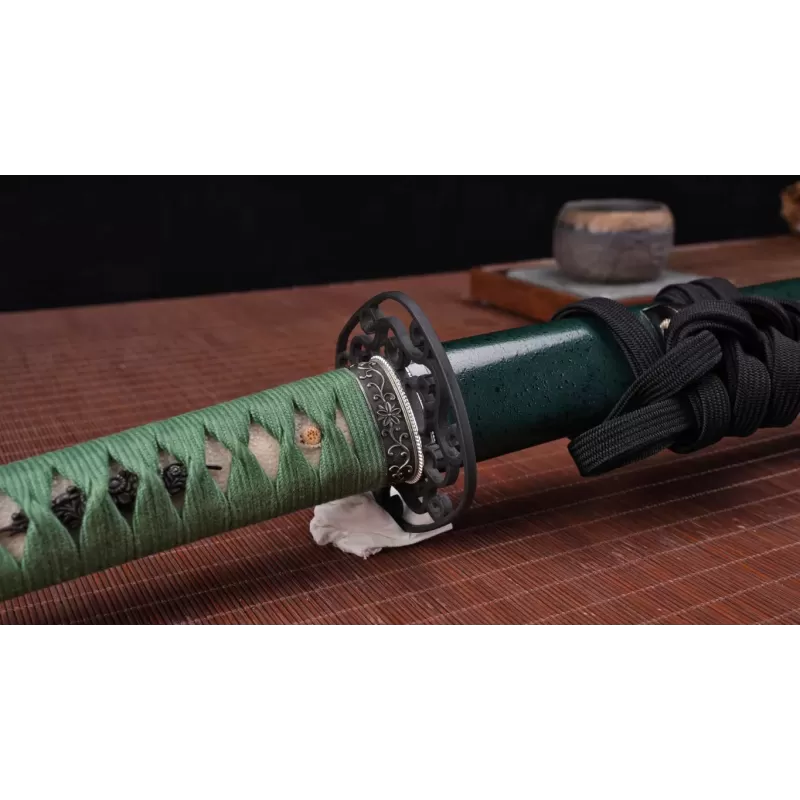 The mounting is refined and harmonious. The tsuba, fuchi and kashira are carefully selected to subtly support the chrysanthemum theme, while the silver-colored habaki and seppa provide a classic finish. The saya is finished in deep green with kuroro koiguchi and buffalo horn details, complemented by a black Japanese sageo for a restrained and elegant appearance.